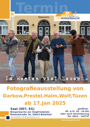 Im März 2024 initiiere ich die Fotogruppe „Im Westen“ mit dem Ziel, dokumentarische und künstlerische Fotografien mit einem Ortsbezug auszustellen. Vom 17.1.2025 - 28.2.2025 gibt es eine Gruppenausstellung der Fotogruppe „Im Westen“ in der Bürgerwache, Siegfriedsplatz, Bielefeld mit Bildern „rund um den Siggi“.